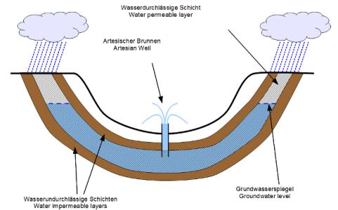 Der artesische Brunnen ist ein natürlicher Brunnen, aus dem Grundwasser wie aus einem System kommunizierender Röhren durch Überdruck aufsteigt.